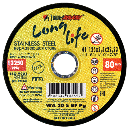 Варианты названия: Абразивный круг (диск) 125 х 6 х 22,23 A Зерно 24; Круг прямого профиля 1 125 6 22,23 A 24 R BF 80 prem. Круг армированный на бакелитовой связке; 125 х 6 х 22,23 A Зерно 24 12250 об/мин