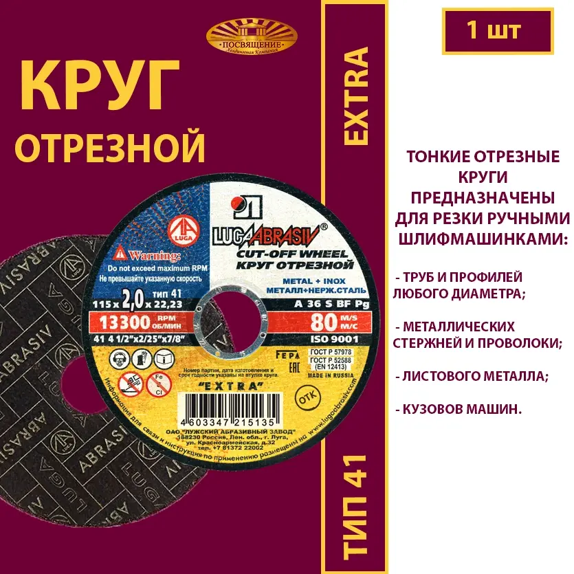 Варианты названия: Абразивный круг (диск) 125 х 2 х 22,23 A Зерно 36; Круг отрезной 41 125 2 22,23 A 36 S BF 80 ex. Круг отрезной армированный; 125 х 2 х 22,23 A Зерно 36 12250 об/мин