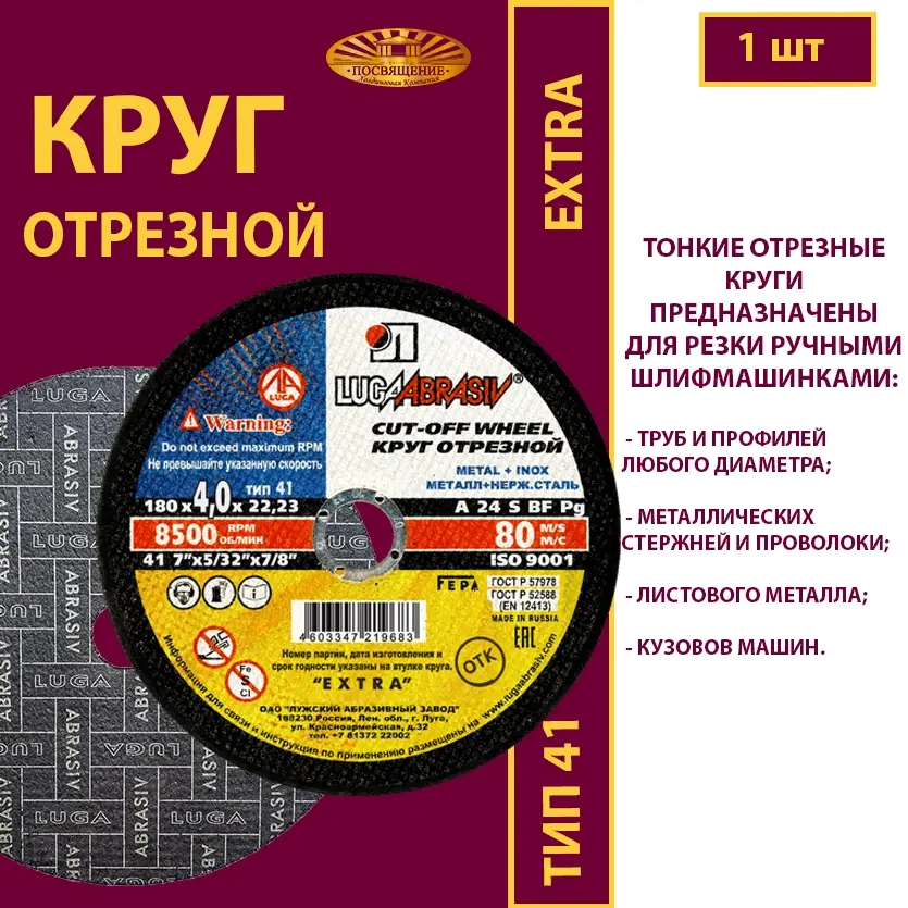 Варианты названия: Абразивный круг (диск) 180 х 4 х 22,23 A Зерно 24; Круг отрезной 41 180 4 22,23 A 24 S BF 80 ex Круг отрезной армированный; 180 х 4 х 22,23 A Зерно 24 8500 об/мин